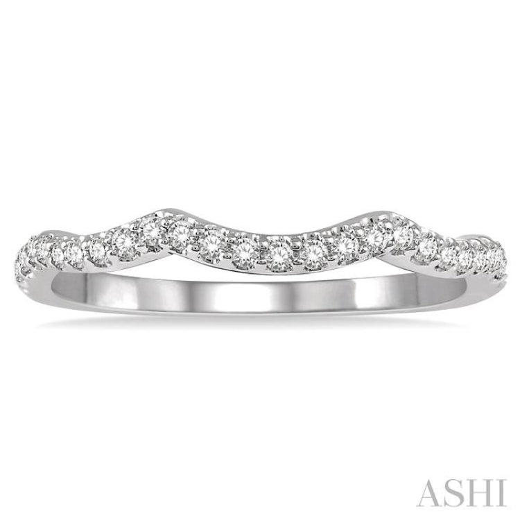 This charming wedding band features a refined wave cut pattern that is quite eye-catching. Its curvy design allows it to be worn along with an engagement ring with a similar wavy center that fits into the curved grooves. The wedding band is attractively enhanced by 31 prong set round cut diamonds lined in a neat glittering row. It is designed in 14 karat white gold. The total diamond weight is 1/5 Ctw.