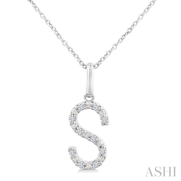 The initial 'S' holds significance for many, representing names, loved ones, or personal mantras. Whether worn as a symbol of self-expression or as a thoughtful gift for someone special, this diamond fashion pendant is a delightful expression of personal style, featuring the initial 'S' embellished with sparkling round cut diamonds. 10 prong set round cut diamonds delicately accentuate the letter, adding a touch of beauty to the pendant. Paired with a sleek Cable Chain 1.00 MM in 18 Inches with Spring Lock & Extenders at 16" & 17", both of which are styled in a rhodium finish sterling silver, this pendant is perfect for everyday wear. The total diamond weight is 1/20 Ctw.