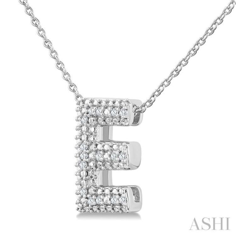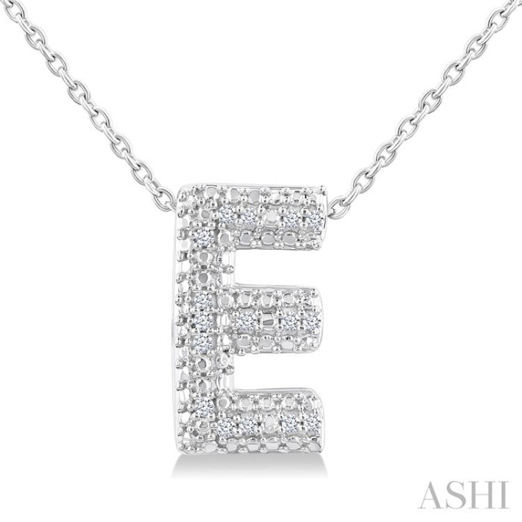 Perfect for gifting or treating yourself, this charming, personalized diamond initial fashion pendant captures the essence of individuality and sophistication. It features a bubble-textured face that adds a touch of whimsy and elegance to the design. The initial 'E' is embellished with 16 prong set round cut diamonds, which sparkle brilliantly against the sleek silver backdrop. Paired with a delicate Cable Chain 1.00 MM in 18 Inches with Spring Lock & Extenders at 16" & 17", both the pendant and chain are styled in a rhodium finish sterling silver. Whether worn alone or layered with other necklaces, this stunning initial fashion pendant is sure to become a cherished piece in your jewelry collection. The total diamond weight is 1/20 Ctw.
