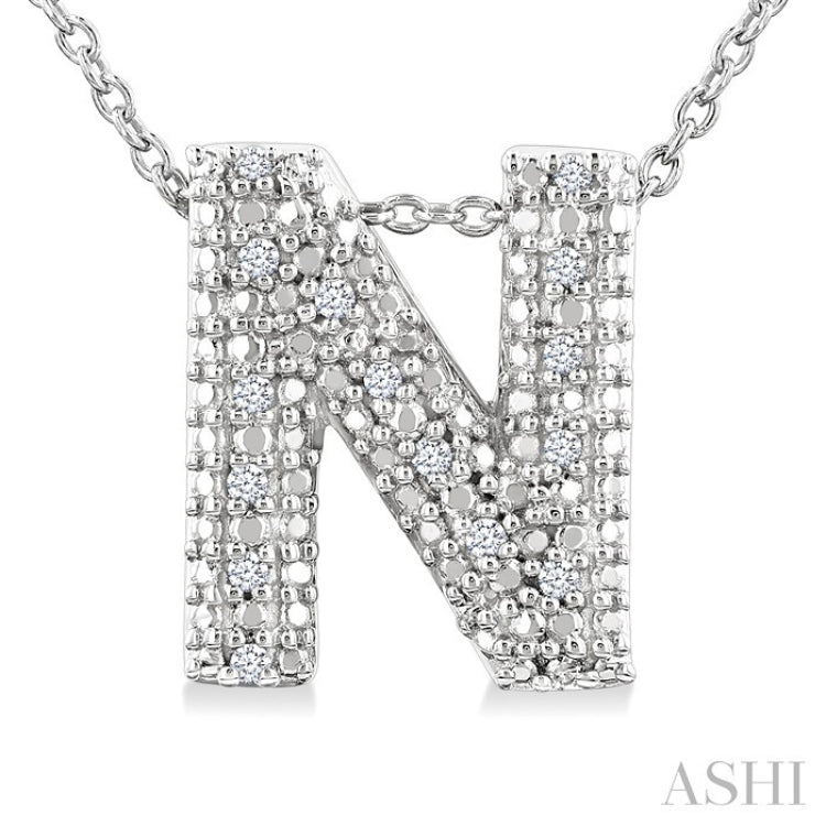 Perfect for gifting or treating yourself, this charming, personalized diamond initial fashion pendant captures the essence of individuality and sophistication. It features a bubble-textured face that adds a touch of whimsy and elegance to the design. The initial 'N' is embellished with 16 prong set round cut diamonds, which sparkle brilliantly against the sleek silver backdrop. Paired with a delicate Cable Chain 1.00 MM in 18 Inches with Spring Lock & Extenders at 16" & 17", both the pendant and chain are styled in a rhodium finish sterling silver. Whether worn alone or layered with other necklaces, this stunning initial fashion pendant is sure to become a cherished piece in your jewelry collection. The total diamond weight is 1/20 Ctw.
