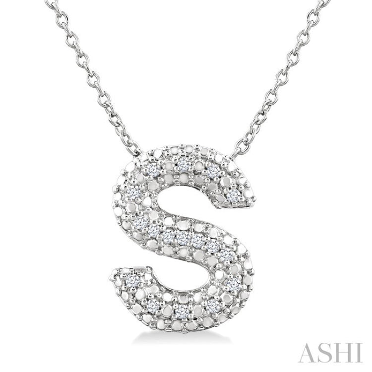 Perfect for gifting or treating yourself, this charming, personalized diamond initial fashion pendant captures the essence of individuality and sophistication. It features a bubble-textured face that adds a touch of whimsy and elegance to the design. The initial 'S' is embellished with 17 prong set round cut diamonds, which sparkle brilliantly against the sleek silver backdrop. Paired with a delicate Cable Chain 1.00 MM in 18 Inches with Spring Lock & Extenders at 16" & 17", both the pendant and chain are styled in a rhodium finish sterling silver. Whether worn alone or layered with other necklaces, this stunning initial fashion pendant is sure to become a cherished piece in your jewelry collection. The total diamond weight is 1/20 Ctw.