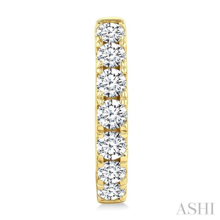Striking and sophisticated, these diamond fashion hoop earrings make a bold statement with timeless brilliance. Each hoop showcases a front-facing row of 7 microscopic split 1/10 Ctw prong set round cut diamonds, meticulously arranged along the curve for maximum sparkle, totaling 14 diamonds across the pair. The generous diamond weight creates a dazzling effect, perfect for elevating both day and evening looks. Designed in 14 karat yellow gold, these diamond fashion hoops combine classic design with modern elegance. Total diamond weight is 1 1/2 Ctw.